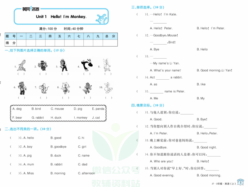 三年级英语上册人教精通版《黄冈名卷》