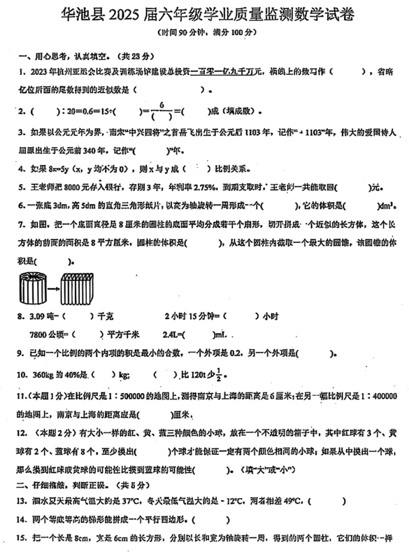 甘肃省庆阳市华池县2024-2025学年六年级下学期小升初数学试卷