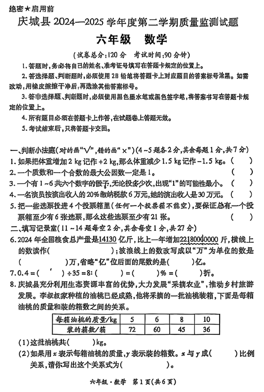 甘肃省庆阳市庆城县2024-2025学年六年级下学期小升初数学试题