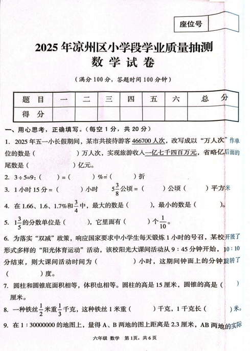 甘肃省武威市凉州区2024-2025学年六年级下学期毕业考试数学试题