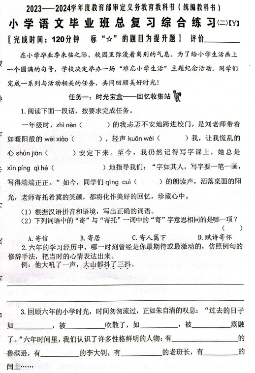 福建省泉州市(Y卷)2024-2025学年六年级下学期期末语文毕业总复习综合练习二