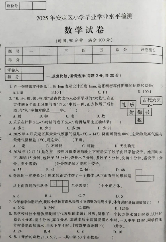 甘肃省定西市安定区2024-2025学年六年级下学期小升初毕业学业水平检测考试数学试卷