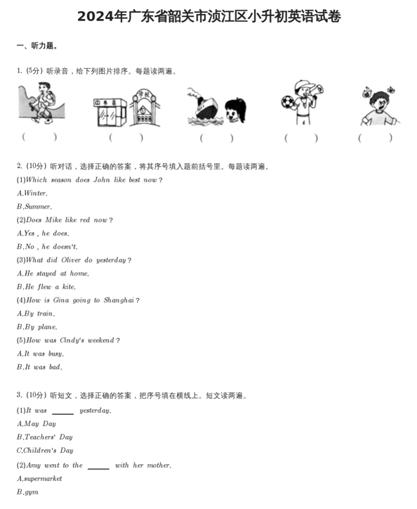 广东省韶关市浈江区2023-2024学年六年级下学期英语小升初试卷