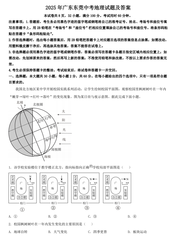 2025年广东东莞中考地理试题及答案