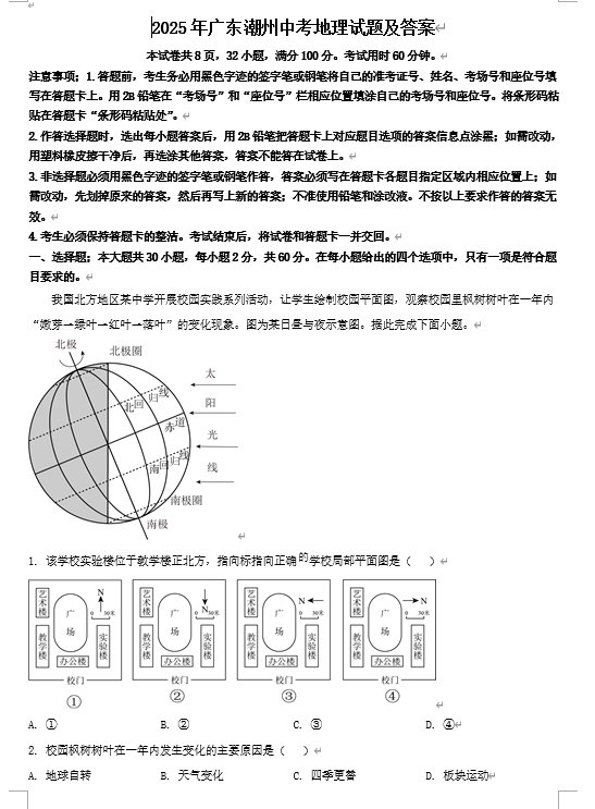 2025年广东潮州中考地理试题及答案