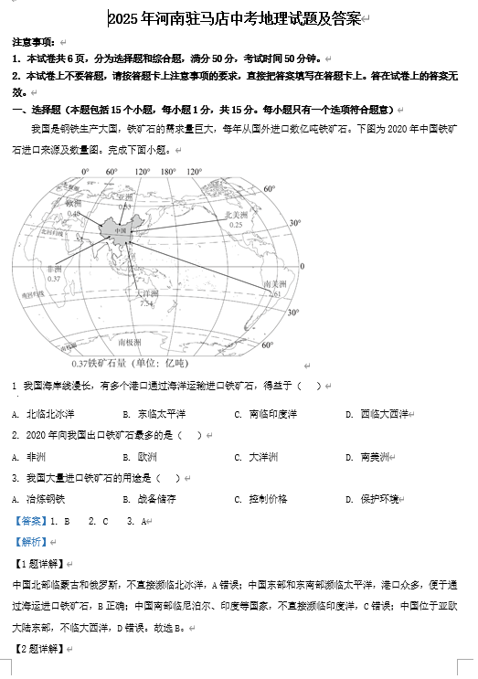 2025年河南驻马店中考地理试题及答案