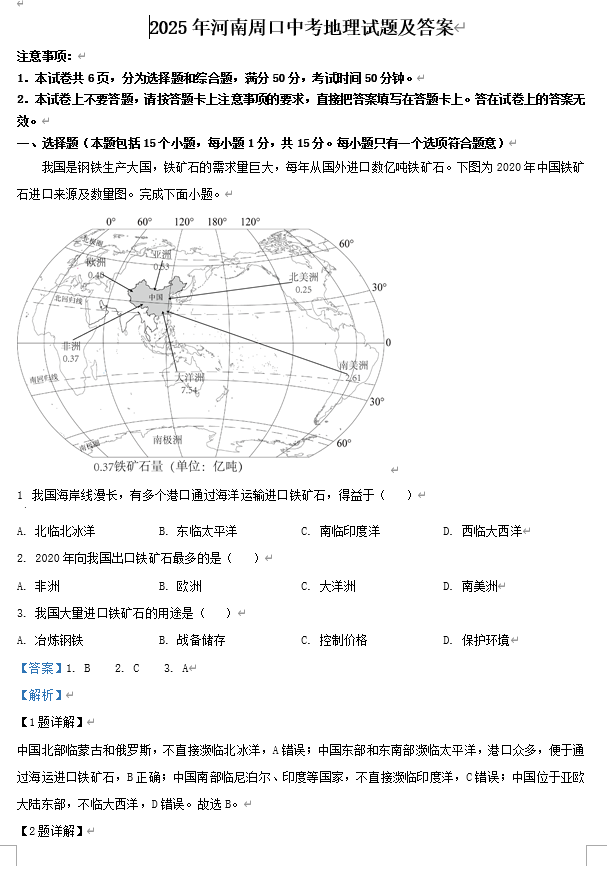 2025年河南周口中考地理试题及答案