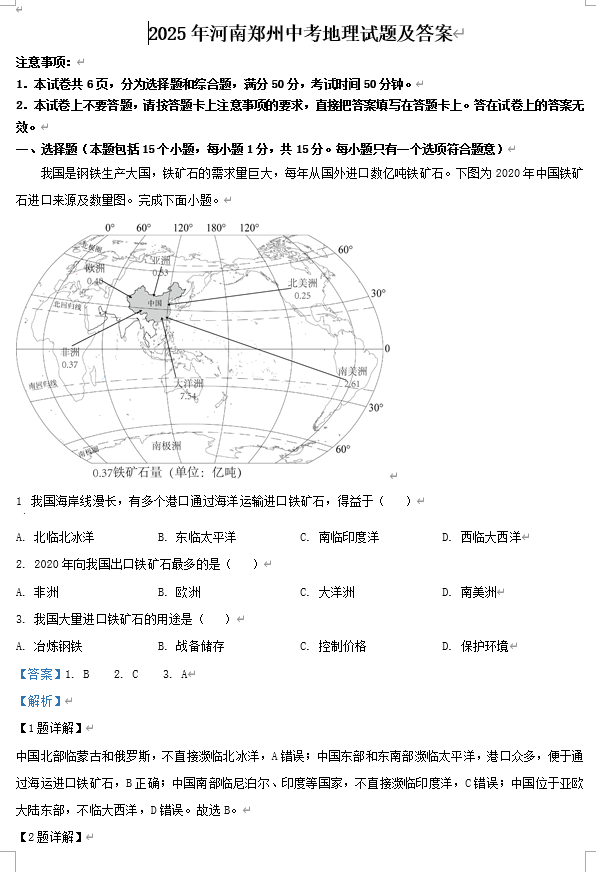 2025年河南郑州中考地理试题及答案