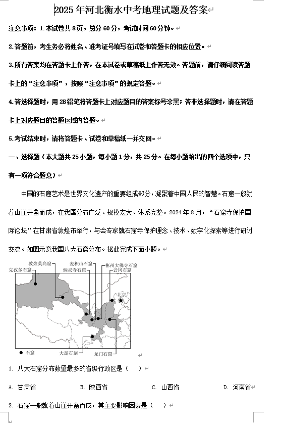 2025年河北衡水中考地理试题及答案