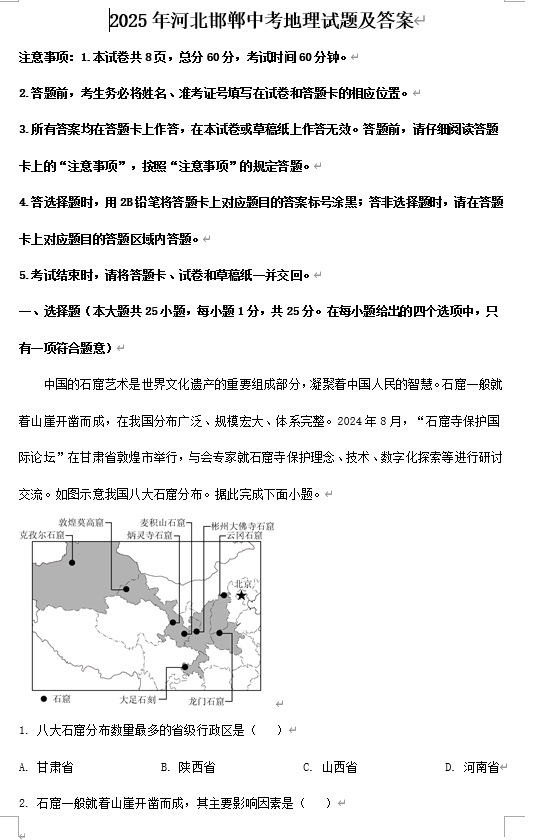 2025年河北邯郸中考地理试题及答案