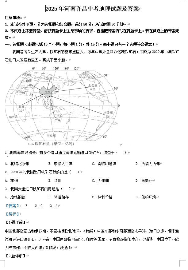 2025年河南许昌中考地理试题及答案
