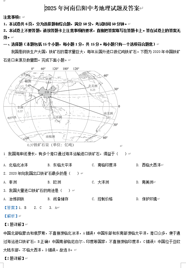 2025年河南信阳中考地理试题及答案
