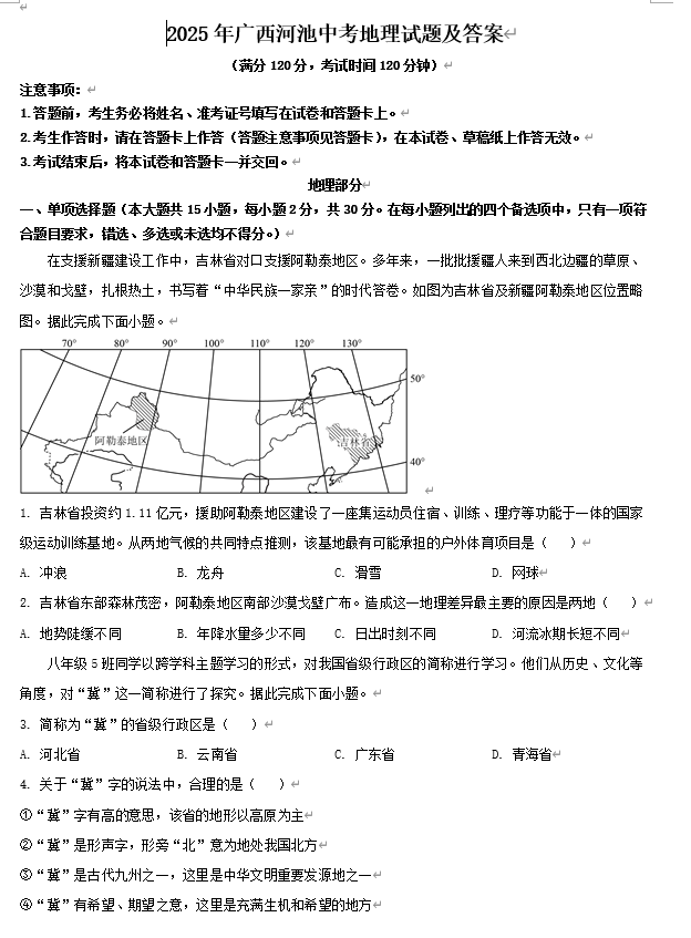 2025年广西河池中考地理试题及答案