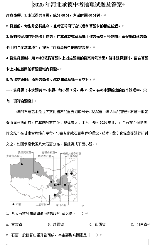 2025年河北承德中考地理试题及答案