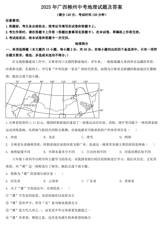 2025年广西柳州中考地理试题及答案