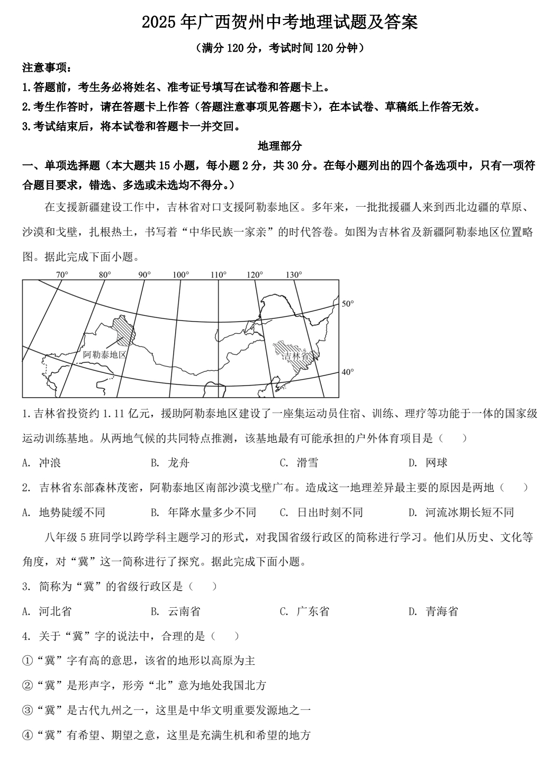 2025年广西贺州中考地理试题及答案