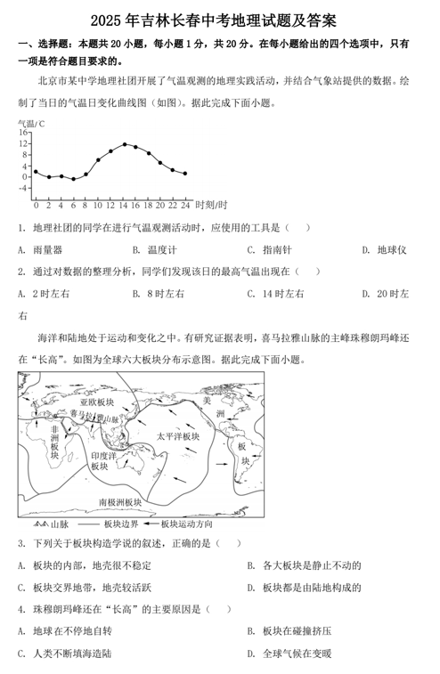 2025年吉林长春中考地理试题及答案