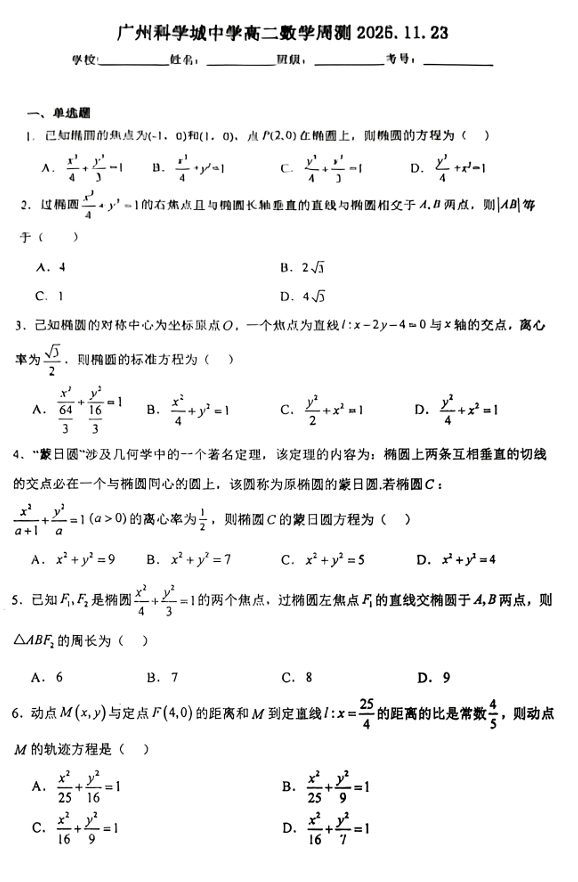 广东省广州市科学城中学2025-2026学年高二上学期数学周测卷11.23