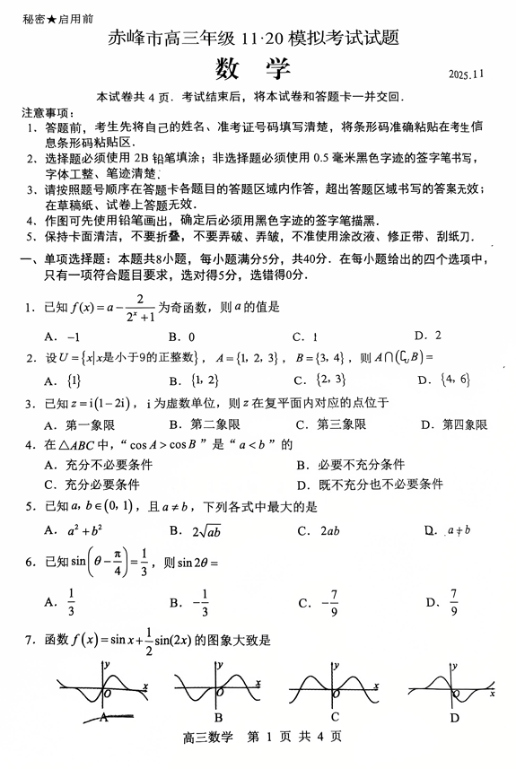 内蒙古赤峰市2025-2026学年高三上学期11.20模拟考试数学试题