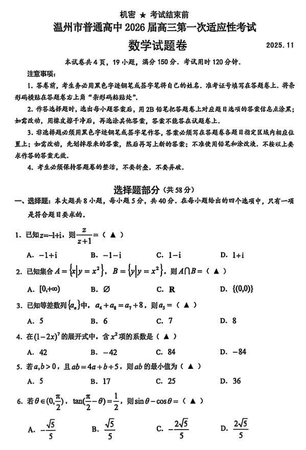 浙江省温州市普通高中2026届高三第一次适应性考试数学试题