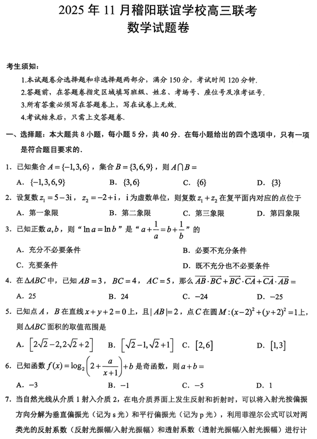 辽宁省沈阳市二十中学2025-2026学年高三上学期三模考试数学试卷