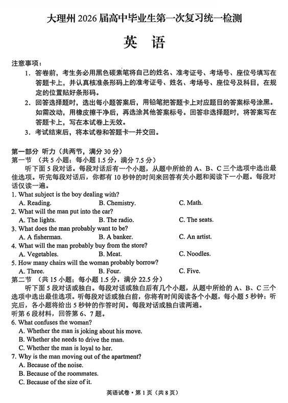 2026届云南省大理白族自治州高三上学期一模英语试题