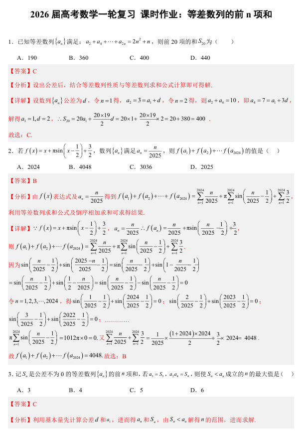 2026届高考数学一轮复习+课时作业:等差数列的前n项和