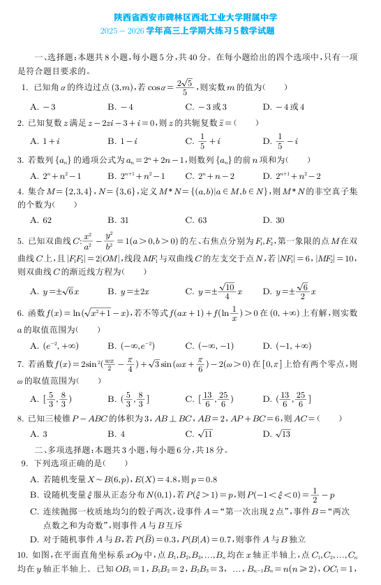 陕西省西安市碑林区西北工业大学附属中学2025-2026学年高三上学期数学大练习5