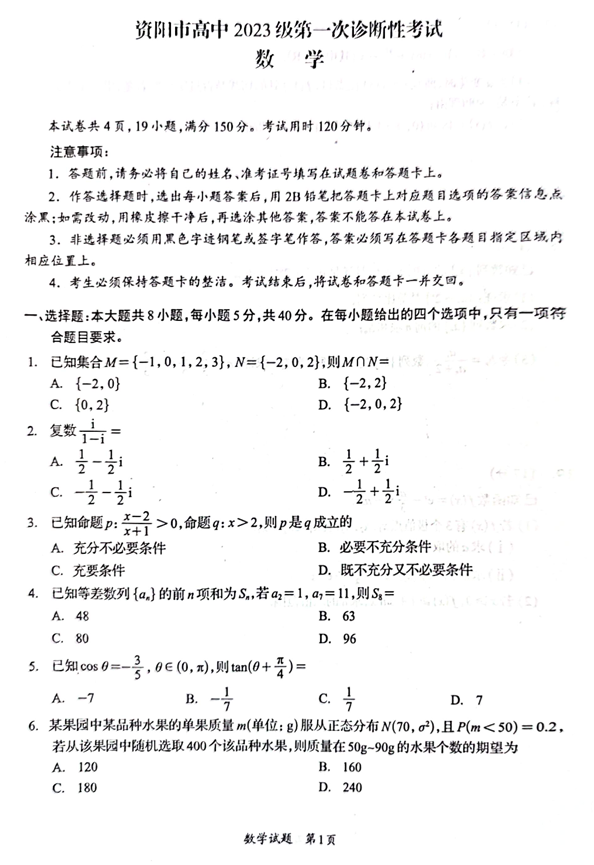 四川省资阳市2026届高三第一次诊断性考试数学试题
