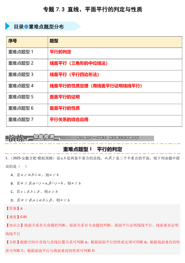 2026《高考数学•一轮复习重点难点题型》精练 专题7.3 直线 平面平行的判定与性质(七类重难点题型精练)