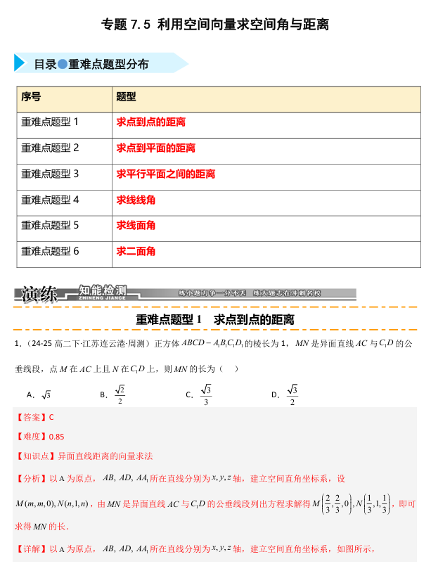 2026《高考数学•一轮复习重点难点题型》精练 专题7.5 利用空间向量求空间角与距离(六类重难点题型精练)