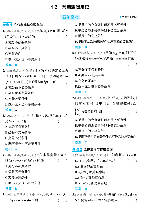 2026《53高考总复习A版》数学 精练册 1 2 常用逻辑用语