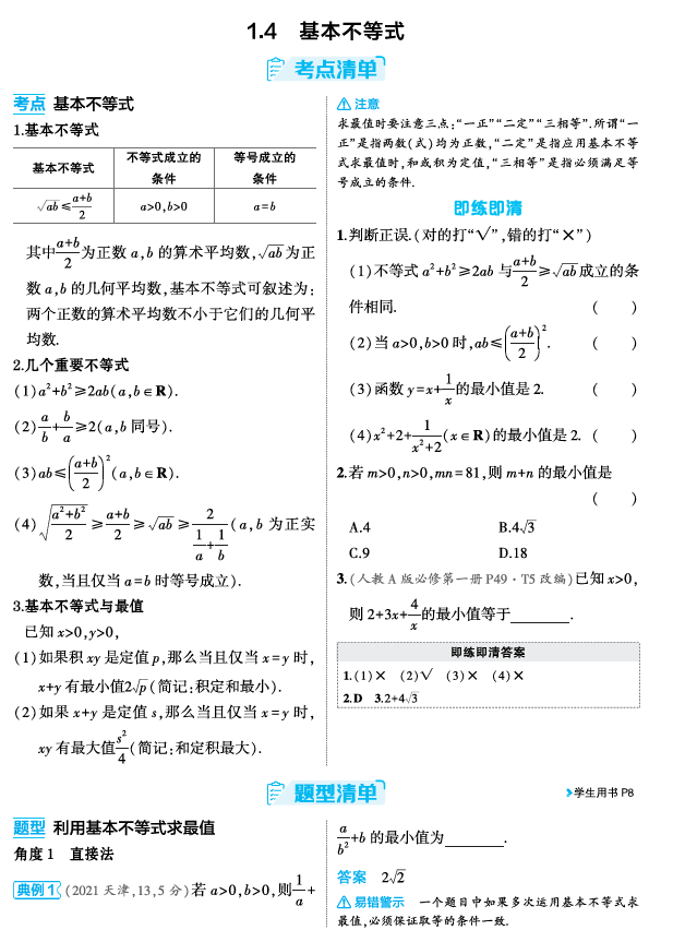 2026《53高考总复习A版》数学 精讲 1 4 基本不等式