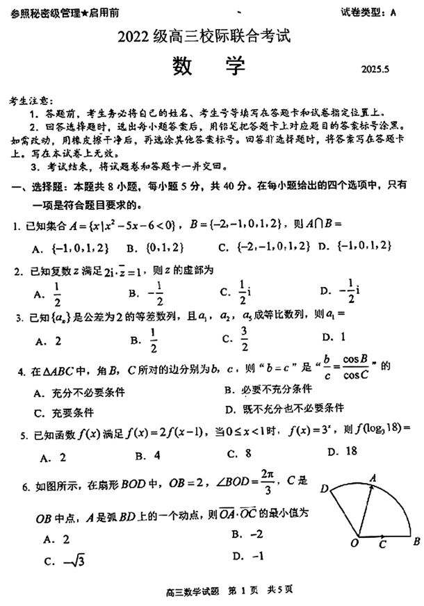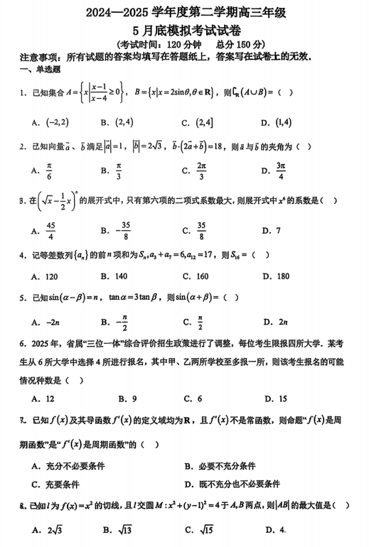 山东省日照市2025届高三下学期5月校际联合考试数学试卷