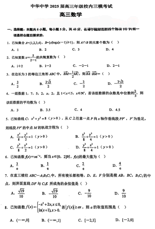 江苏省南京市中华中学2025届高三校内三模考试数学试题