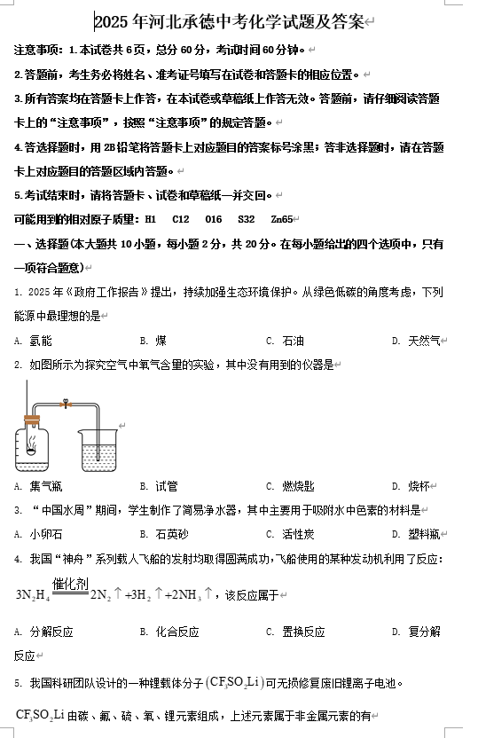 2025年河北承德中考化学试题及答案