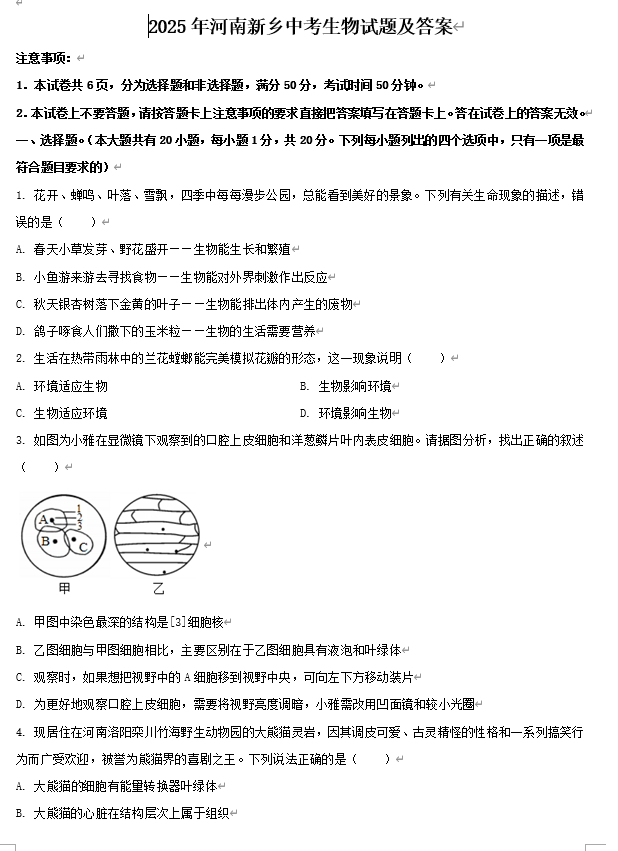 2025年河南新乡中考生物试题及答案