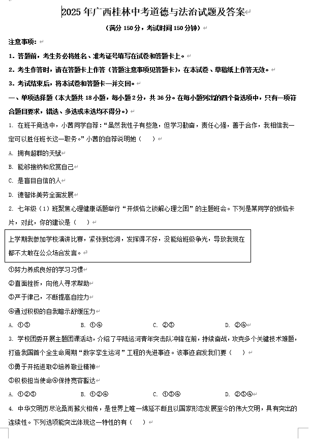 2025年广西桂林中考道德与法治试题及答案