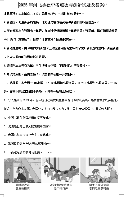 2025年河北承德中考道德与法治试题及答案