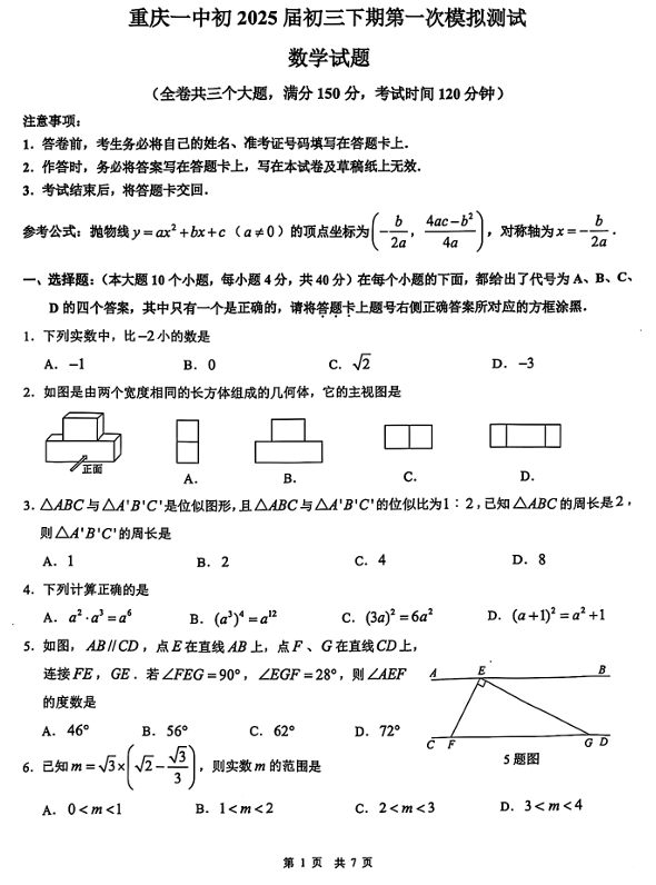 2025年重庆市第一中学校中考数学一模试卷