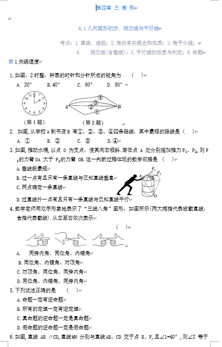第四章+三+角+形4.1几何图形初步、相交线与平行线练习2025年苏科版九年级数学中考总复习+