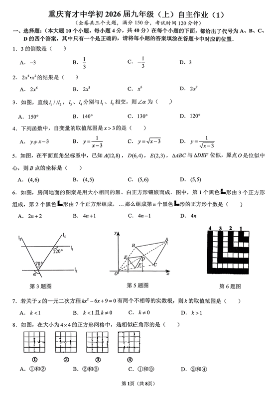 重庆市九龙坡区育才中学校2025-2026学年上学期九年级数学第一次自主作业试卷
