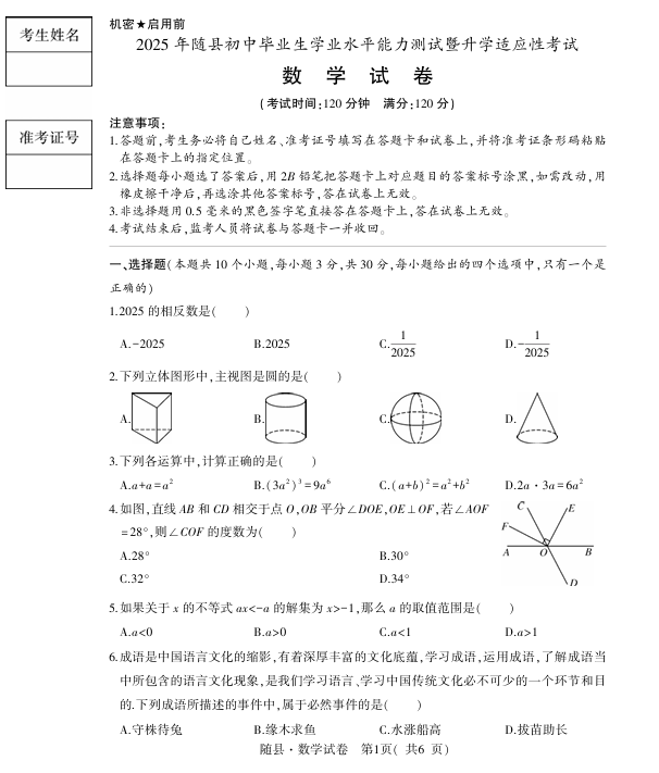 2025年湖北省随州市随县初中毕业生学业水平能力测试暨升学适应性考试数学试卷