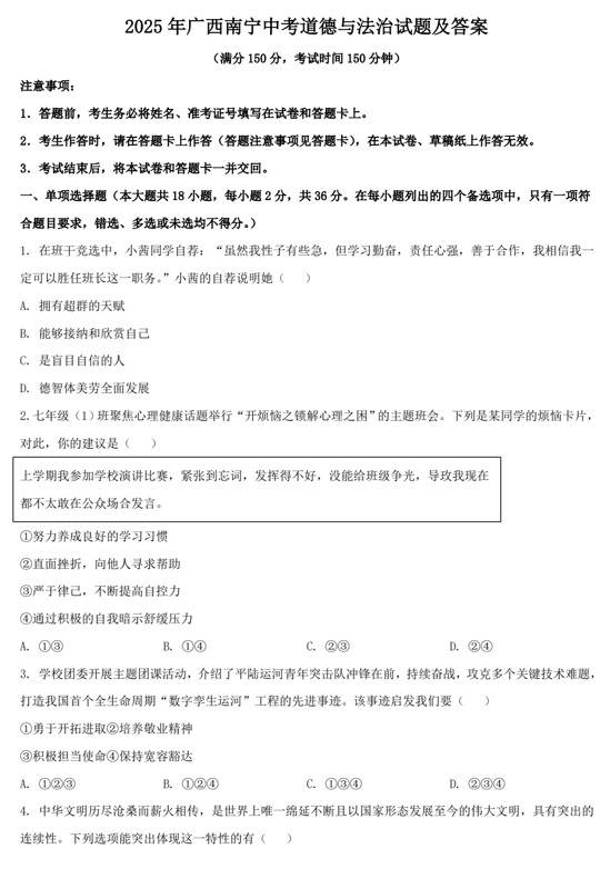 2025年广西南宁中考道德与法治试题及答案