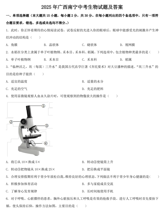 2025年广西南宁中考生物试题及答案