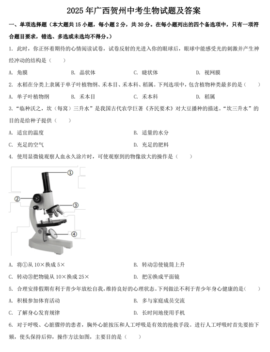 2025年广西贺州中考生物试题及答案