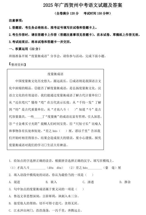 2025年广西贺州中考语文试题及答案