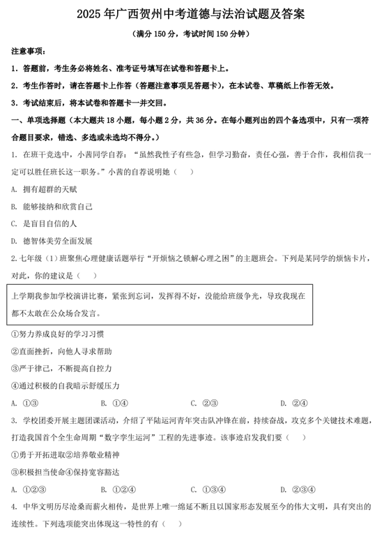 2025年广西贺州中考道德与法治试题及答案