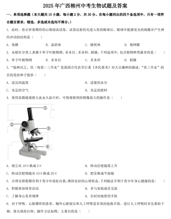 2025年广西柳州中考生物试题及答案
