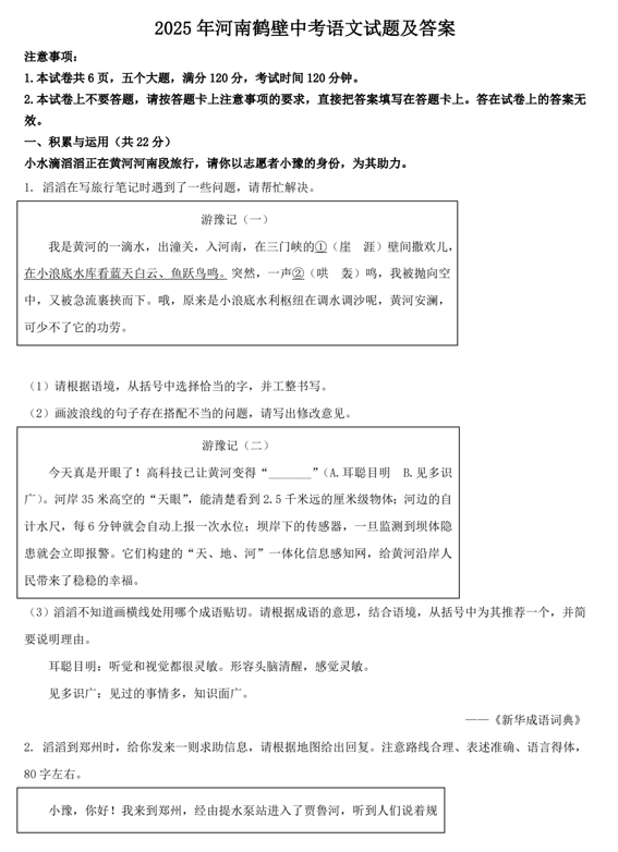 2025年河南鹤壁中考语文试题及答案